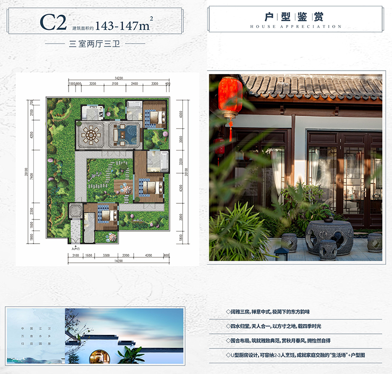 户型解析 阔雅三房,禅意中式,极简下的东方韵味 四水归堂,天人合一,以方寸之地,载四季时光 围合布局,筑就雅致典范,赏秋月春风,拥怡然自得 U型厨房设计,可容纳2-3人烹饪,成就家庭交融的“生活场”+户型图