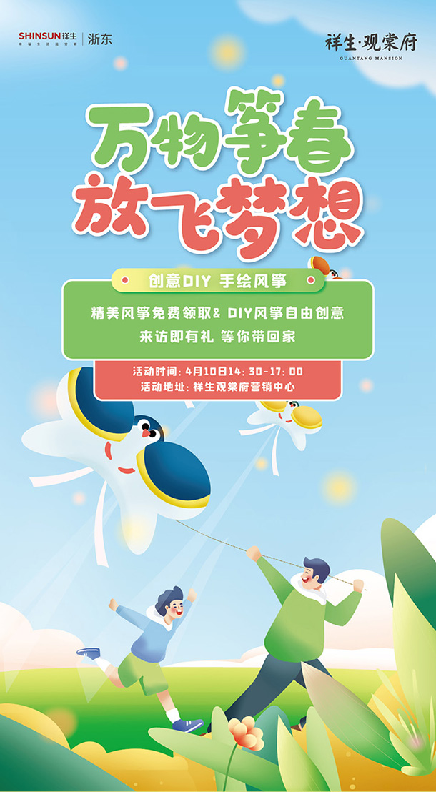 春风摇曳,繁华染进正是杨柳青青、草长莺飞之时如此好时节岂能宅在家里浪费春光?阳光暖暖的周末带上宝贝一起来祥生·观棠府亲手绘制属于自己的春天色彩小小风筝承载着大家对于春天的热情用颜色点缀画面,用图案装点创意看风筝偏偏起舞于天空中一起拾趣春天(网络示意图)创意彩绘风筝DIY自己动手搭配颜料、调色、填色让孩子充分发挥自己想象力一笔一画,一...[阅读全文]