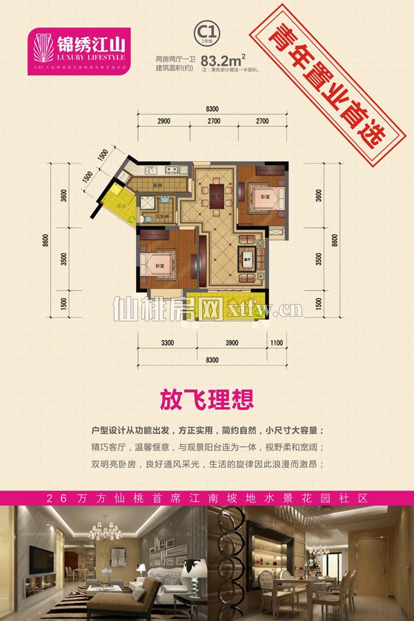 户型解析 放飞理想 户型设计从功能出发,方正实用,简约自然,小尺寸大容量; 精巧客厅,温馨惬意,与观景阳台连为一体,视野柔和宽阔; 双明亮卧房,良好通风采光,生活的旋律以此浪漫而激昂