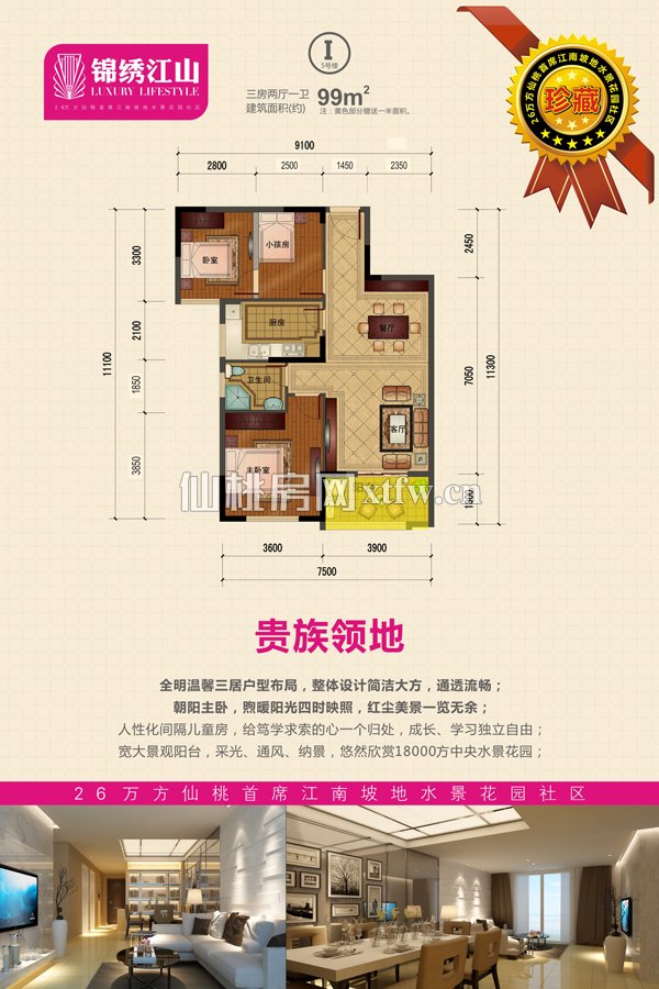 户型解析 贵族领地 全明温馨三居户型布局,整体设计简洁大方,通透流畅; 朝阳主卧,煦暖阳光四时映照,红尘美景一览无余。