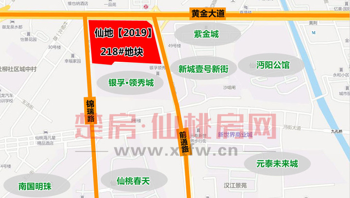 沙嘴办事处黄金大道南侧,前通路西侧(仙地[2019]218号),由现代城建集团摘得,成交楼面地价为2683元/㎡,溢价率13.22%。