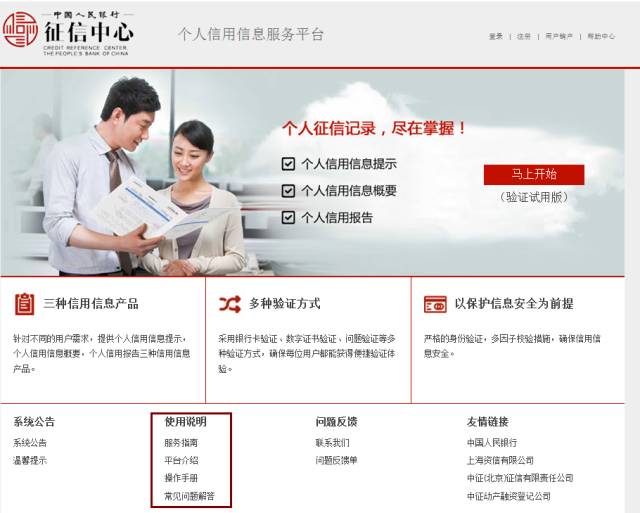 登录中国人民银行征信中心个人信用信息服务平台(以下简称平台),点击【马上开始】,并且逐一填写资料即可。具体操作方法,可以点击平台最下方【使用说明】一栏中的【操作手册】进行操作。