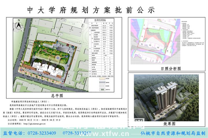 仙桃市中大学府项目设计方案项目位于解放大道北侧与文卫路交汇处。项目规划总用地面积6783平方米,建设用地面积5810平方米,用地性质为居住用地。我局拟审批其项目规划方案,现将总平图、效果图、日照分析图予以公示,公示内容如下: