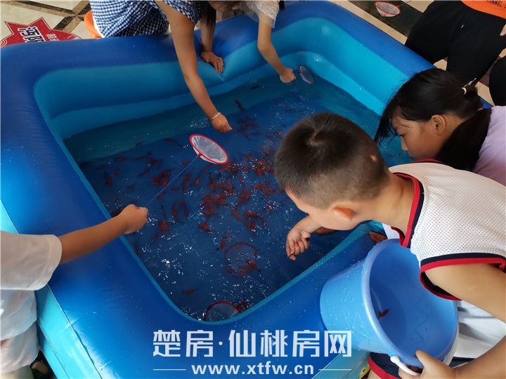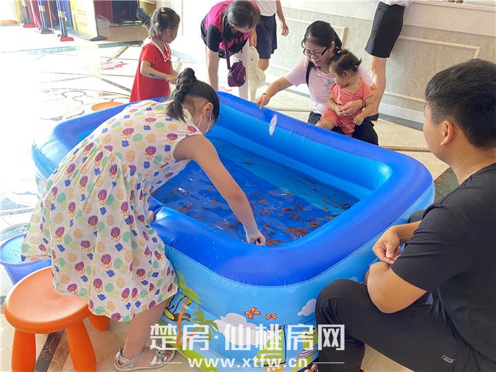 现场的大朋友、小朋友们纷纷拿上工具、撸起袖子,手持捞鱼棒来捞鱼