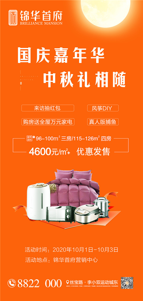 值此中秋国庆双节来临之际,锦华首府助力安家。国庆期间成功认购,即送全屋家电,可直接抵扣房款1万元。还有金蛋大奖等你来拿!