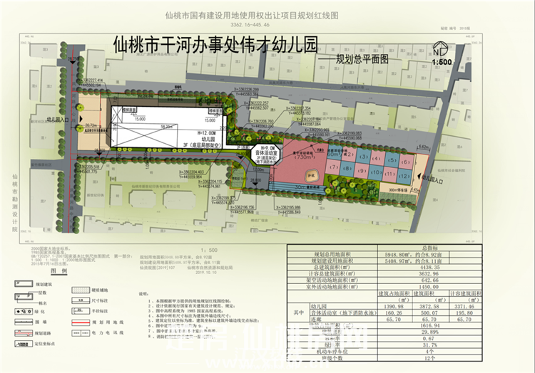 干河办事处伟才幼儿园项目位于凤凰河路以东、仙桃社会福利院以西、仙桃市新世纪印务有限公司以北。项目规划总用地面积5948.80平方米,建设用地面积5408.97平方米,用地性质为教育科研用地。规划局拟审批其项目规划方案,现将总平图、效果图予以公示,公示内容如下: