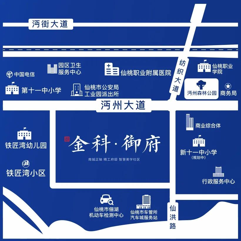 金科.御府项目位于沔州大道、仙洪路交会处,双城市主干道,沔州大道东西向贯通南城新区,仙洪路南北向直达老城,主干道沿线行政、教育、医疗、产业、生态、文化资源丰富坐拥城市至优配套,悦享万千精彩。