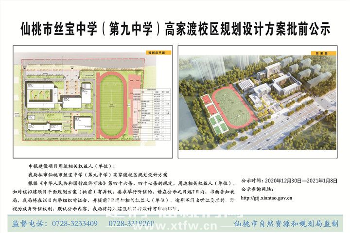 仙桃市丝宝中学申报的仙桃市丝宝中学(第九中学)高家渡校区项目位于仙桃大道以南、汉江农产品大市场以西。规划局拟审批其项目规划方案,现将总平图、效果图予以公示,公示内容如下: