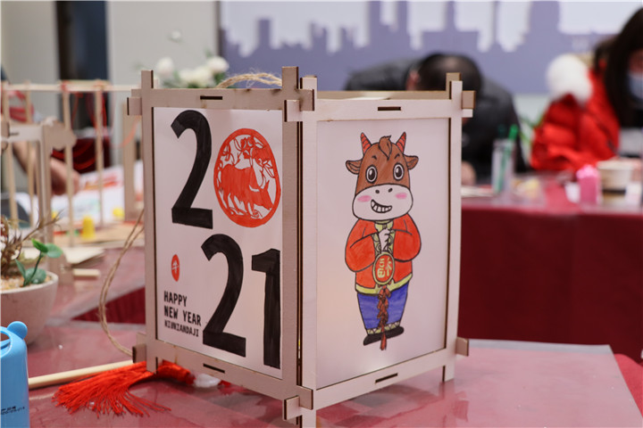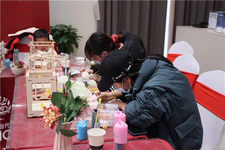 展开折叠的纸质灯笼体,发挥创意和想象,把小花、树枝、花字等图案按照自己的想法画在贴纸上。这个过程中,孩子的耐心和专注力,都得到了有效的锻炼。和家长的沟通互动,催生了温馨的亲子欢乐时光。