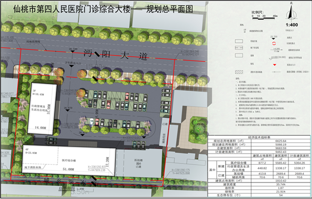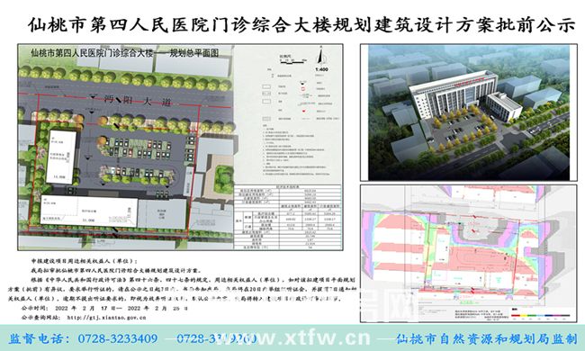 仙桃市第四人民医院申报的门诊综合大楼规划建筑设计,拟审批该项目规划方案,现将总平图、效果图予以公示,公示内容如下: