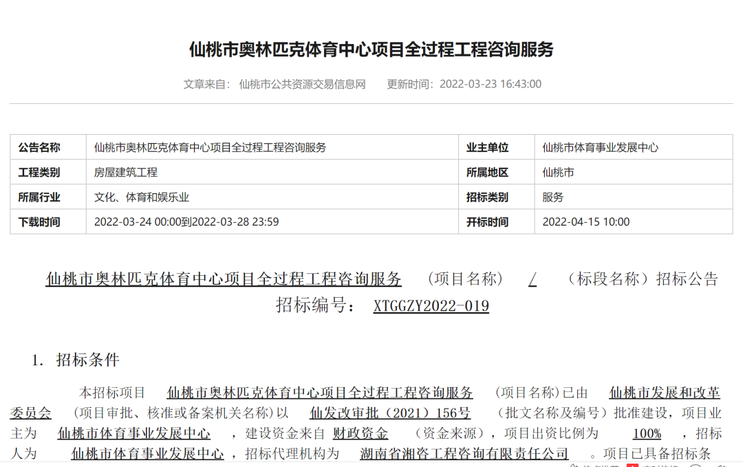 3月23日,仙桃市公共资源交易信息网发布了奥体中心的招标公告及项目概况。