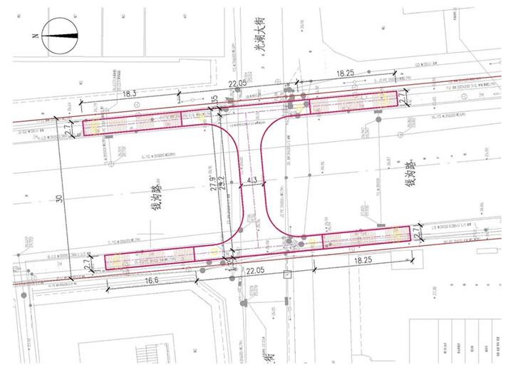 仙桃汉江中学人行天桥选址位于钱沟路与光湖大街交叉口,桥体为H字形设计,主桥长为27.9米,宽为4.3米,同样设有四条梯道上桥。