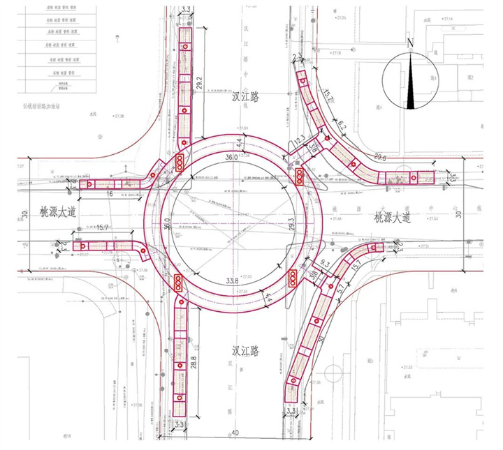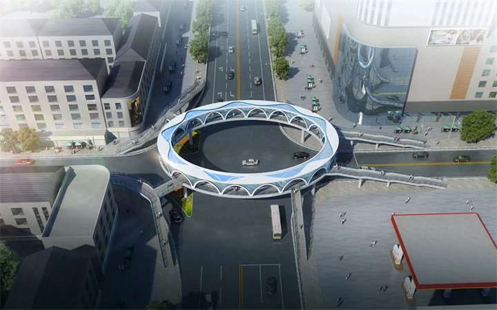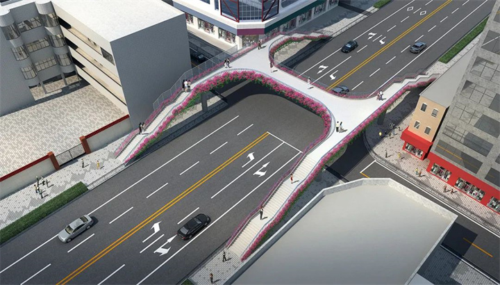 仙桃中学人行天桥选址位于汉江路与桃源大道交叉口,天桥主桥平面为环形设计,宽度4.4米,东西南北四角都有梯道连接上桥。
