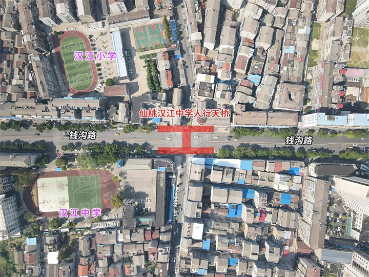 钱沟路是连接仙桃新老城区的主要交通枢纽,汉江小学、汉江中学分别位于钱沟路两侧,过往行人、学生只能依靠两条地面斑马线通行,每到上放学时间,交通难免拥堵,人行天桥对于缓解地面交通,有着举足轻重的作用。