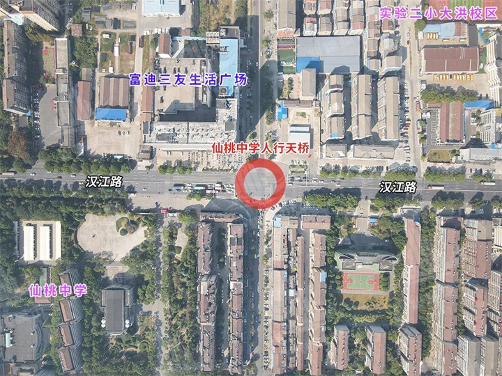 214省道(汉江路)一直是连接仙桃天门两城的主要交通干道,常有众多公交车、私家车和货运车辆通行,而道路两边分别有仙桃中学、实验二小大洪校区两所学校,及富迪三友生活广场购物中心,往来学生、居民众多。