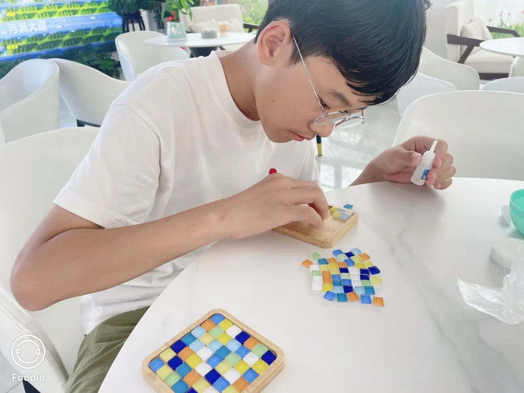 大家认真操作,不时的讨论分享制作窍门,相互欣赏对方的作品,制作过程充满了欢声笑语。不一会,一个个色彩斑斓、独一无二的马赛克杯垫在大家的手中诞生,大家不亦乐乎的欣赏着自己的作品。一个个普通的杯垫变成了一副副色彩斑斓、形态各异的“花砖”杯垫,每一个杯垫都被赋予了新奇的生命。