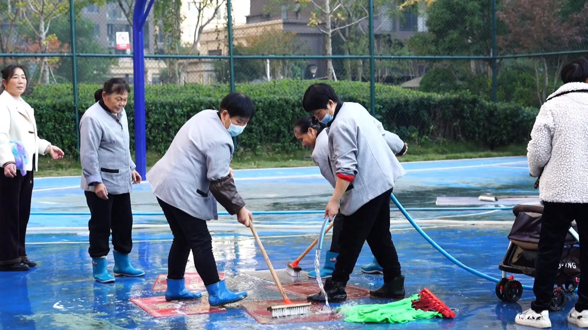 而在当代满庭春小区的运动场上,物业“洗刷刷天团”火力全开,20多人齐上阵,让业主们送来的一块块地垫恢复了鲜亮的颜色。