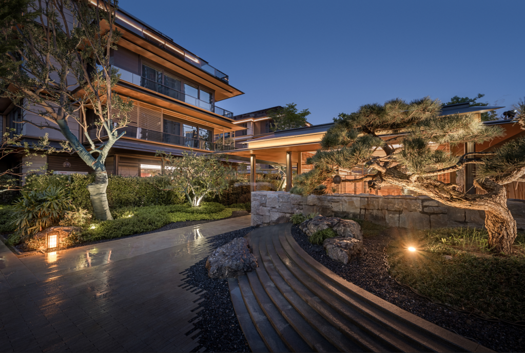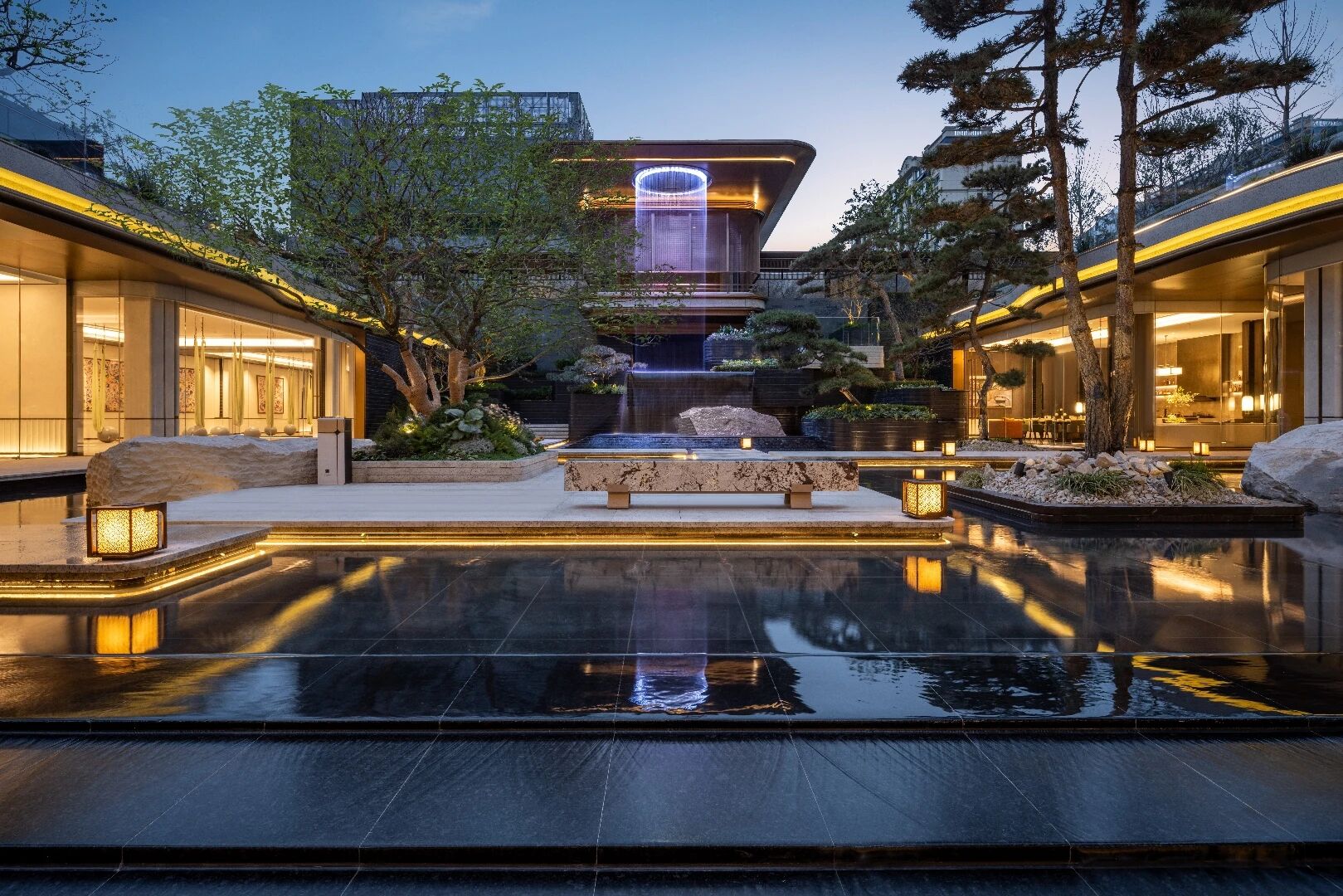 品鉴团一路走过庐外客厅、下沉泳池、风雨连廊、春知学堂、主题架空层等空间场景,院墅景观设计汲取当代宋风画境,呈现出“轩、井、院、榭、廊”五重意境,宾客们移步异景,深刻感受到来自东方的韵味美。
