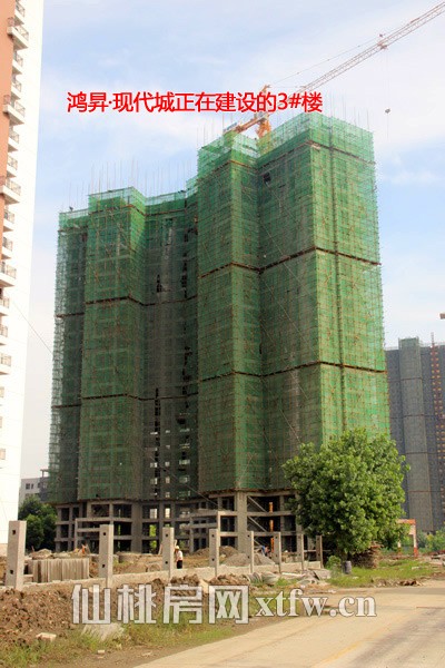 鸿昇·现代城正在建设的3#楼,3#楼共33层,目前已经建至约20层。小区内规划的会所框架已经完工,封顶完成。