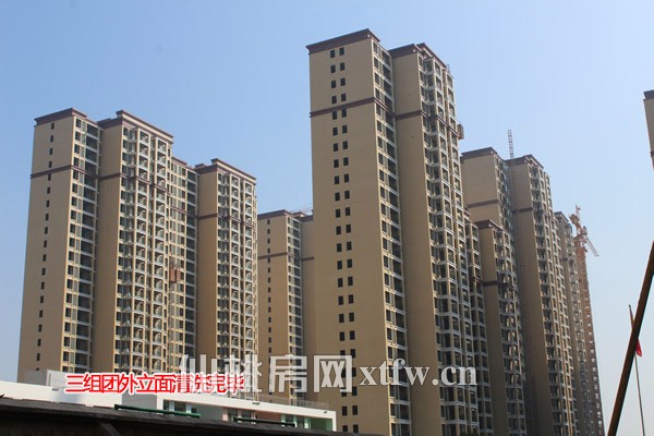 三组团外立面已经清洗完毕,现已呈现。为了能保证到每户的日照与采光时间,由现场照片可以看出,25#楼采取的是两段高,中间楼栋低的设计,大程度的给予每一户业主充足的阳光。接下来的工作便是小区内的地面整平以及绿化施工。