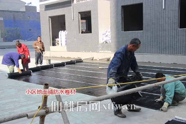 小区内地面正在铺设防水卷材