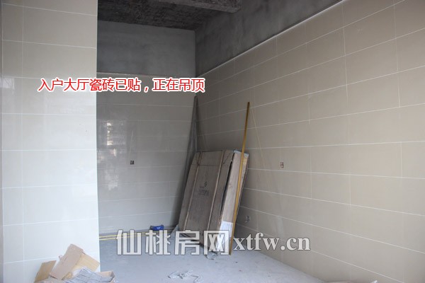 楼内入户大厅已经贴好瓷砖,正在吊顶