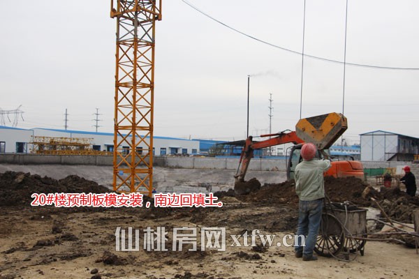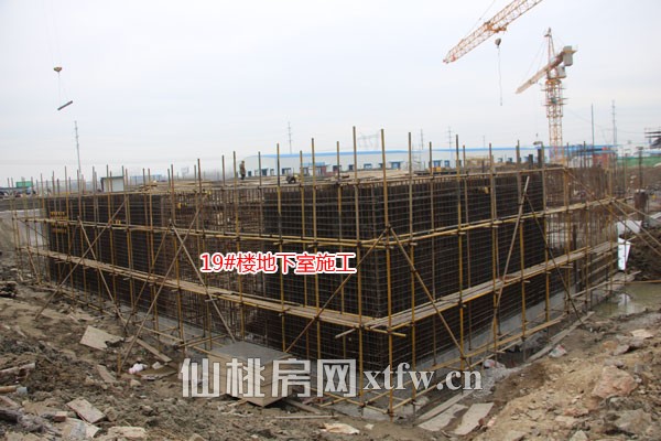 19#楼东边地下室墙柱钢筋绑扎封模,西边回填土。