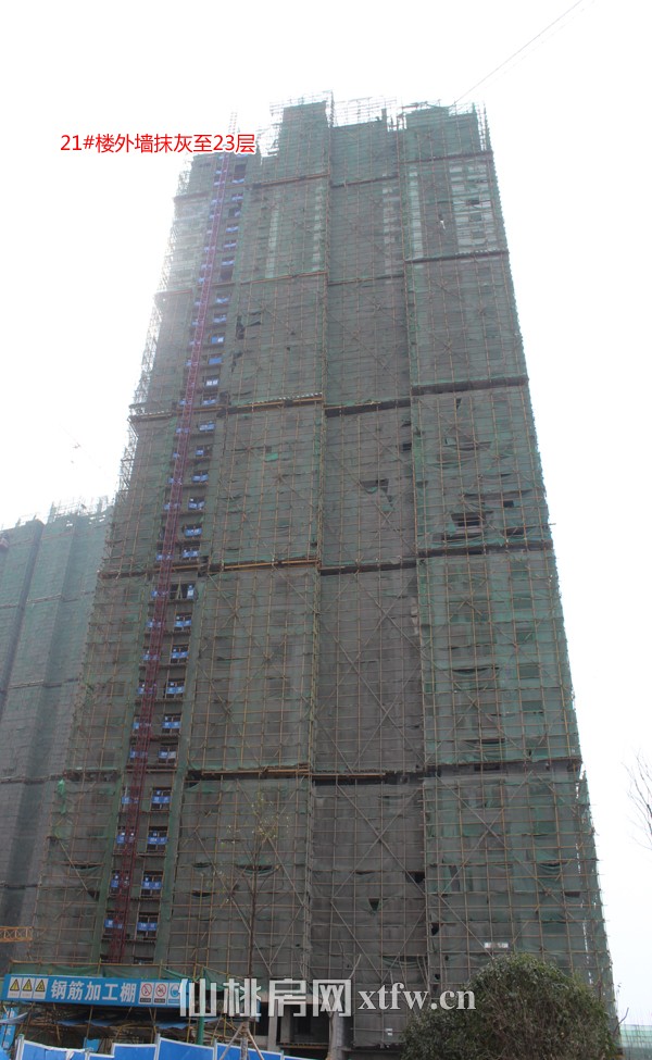 21#楼外墙抹灰至23层,屋面女儿墙压顶梁模板安装,26-31层外墙保温贴板。