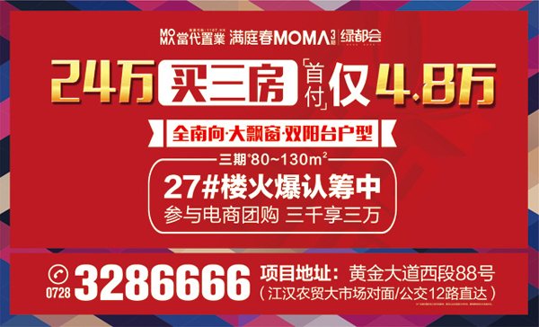 满庭春MOMA项目位于仙桃市黄金大道西段,仙桃城西居住片区,项目总占地约22.6万平米,容积率为3.49,总建筑面积约85.53万平米,绿化率高达40.5%,拥有大型水景公园式园林。