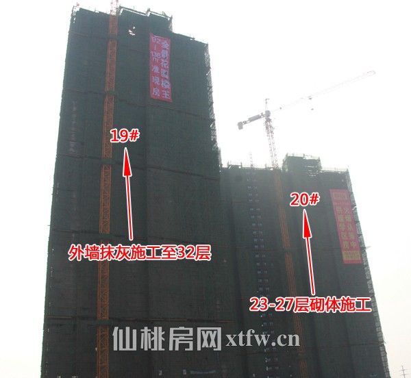 19#楼:已封顶,外墙抹灰施工至32层(19层往下已完成)。