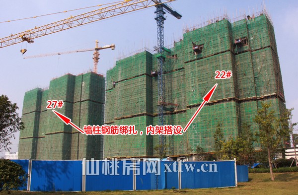 16#、17#、18#楼预备12月份交房,19#、20#已封顶进入外墙施工阶段,22#、27#楼墙柱钢筋绑扎内架搭设,23#、28#基坑施工中。