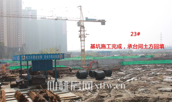 23#楼:基坑施工完成,承台间土方回填。28#楼:基坑土方开挖。