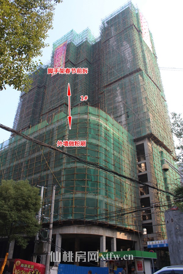 1#楼10月已经封顶,目前还未内砌墙,外墙做粉刷,脚手架春节前拆。