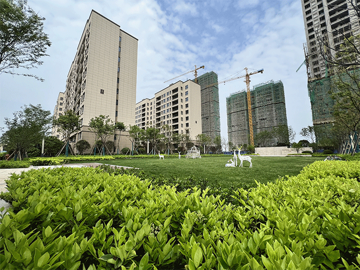 项目一期各类工程基本完工,几乎已达交付标准,目前正在做一些细节收尾工作。小区的实景景观也一目了然,大面积的阳光休憩草坪、道路两旁的大片乔木景观,相信到了交付的时候会更加繁茂。