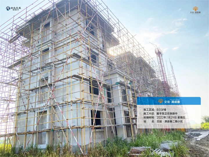 B55号楼已封顶,脚手架架正在拆除中。