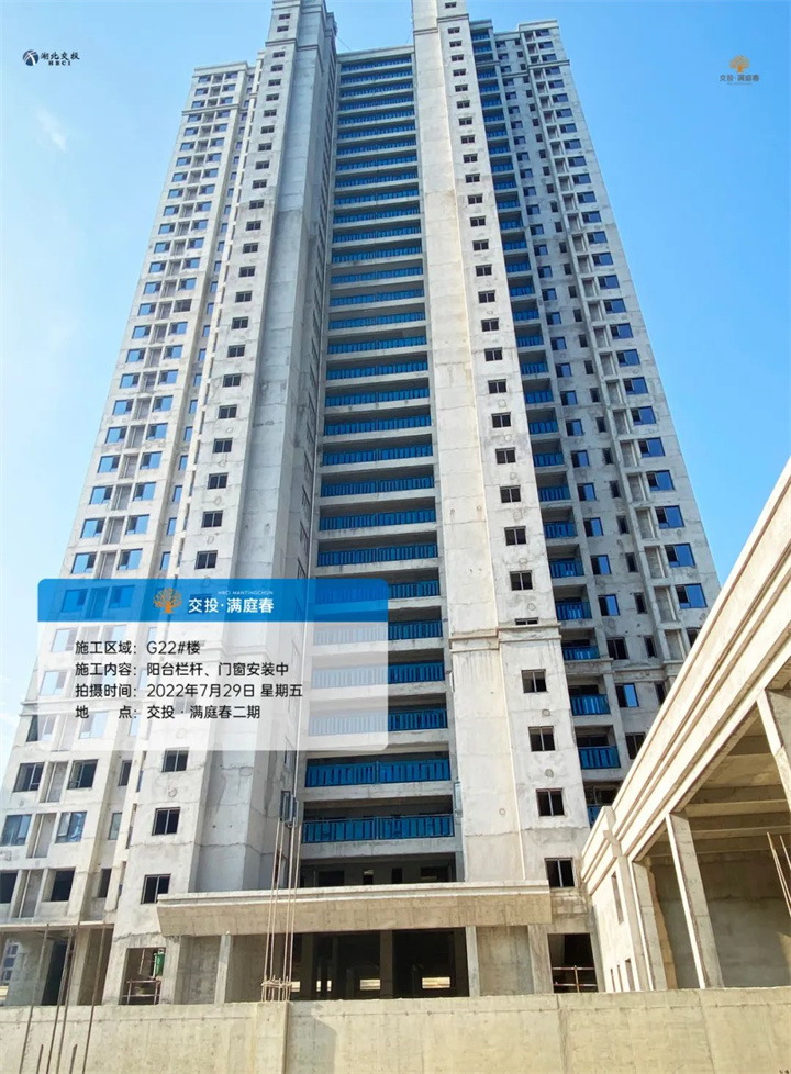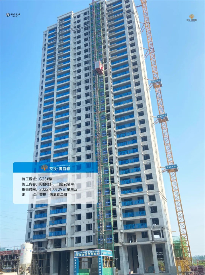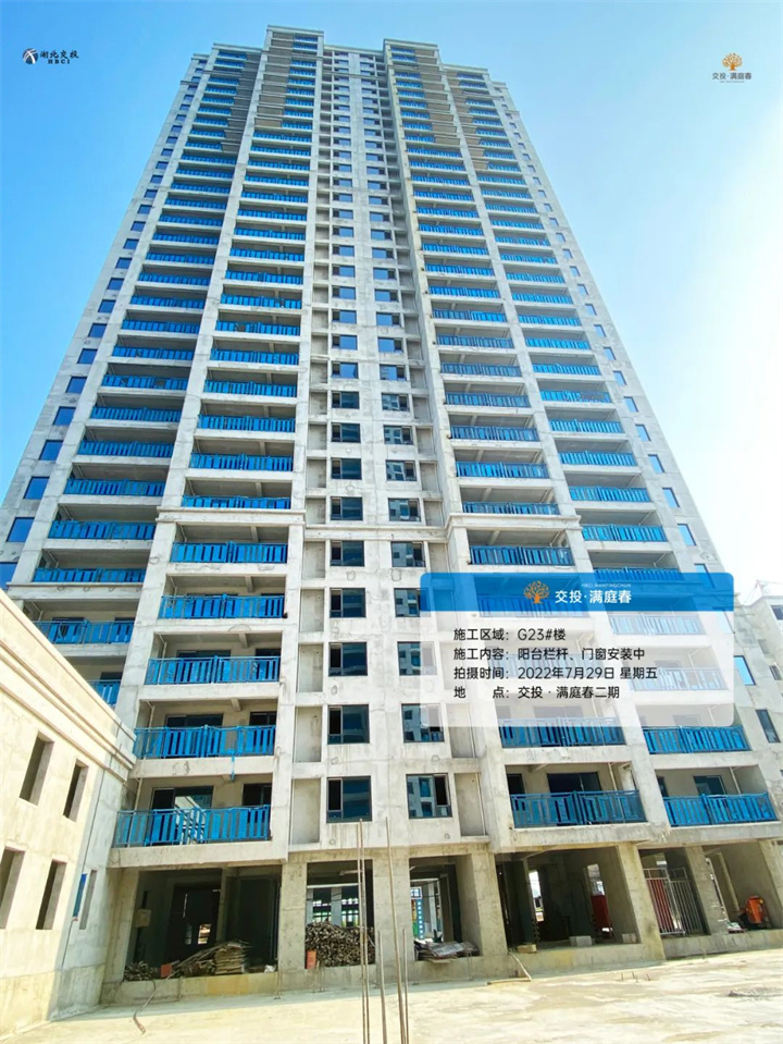 项目二期高层G22/G23/G25号楼砌体已完成、阳台栏杆、门窗框正在同步安装。
