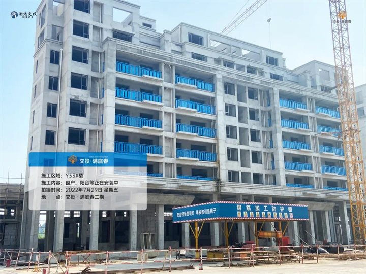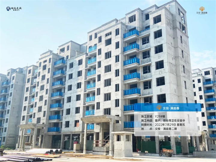 项目二期洋房Y28/Y29/Y30/Y31/Y32/Y33/Y35号楼已封顶,砌体抹灰施工完成,外立面正在施工中,窗户、阳台围栏等正在安装中。