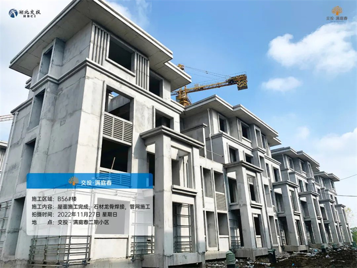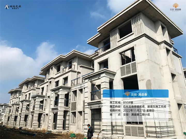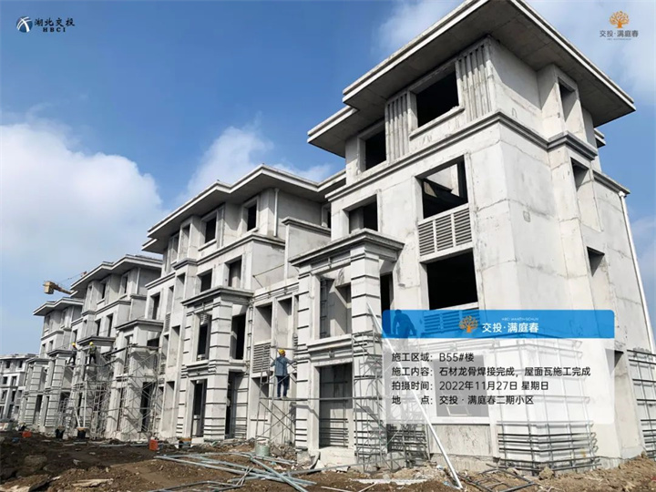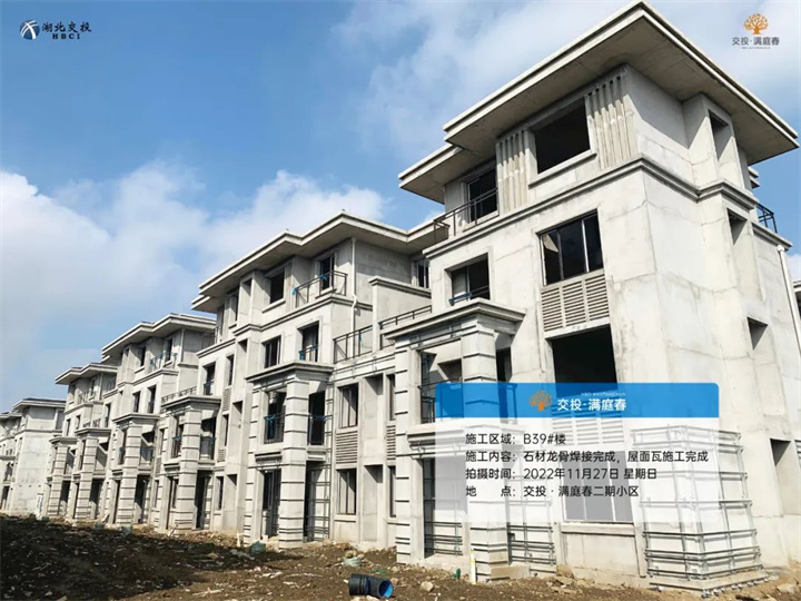 B39#、50#、52#、55#楼土方回填完成,管网施工完成,石材龙骨焊接完成,屋面瓦施工完成;
