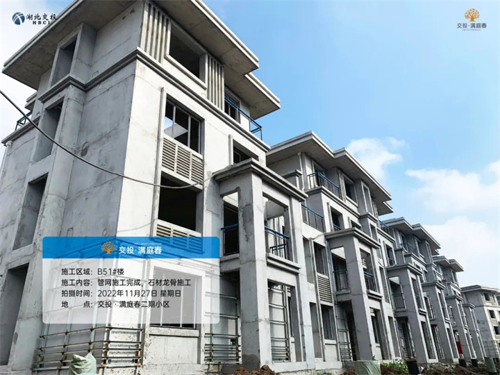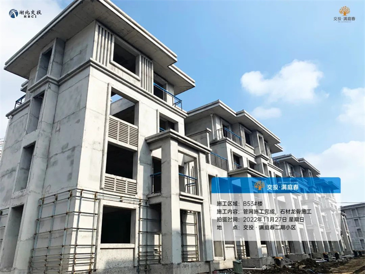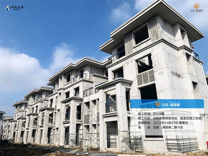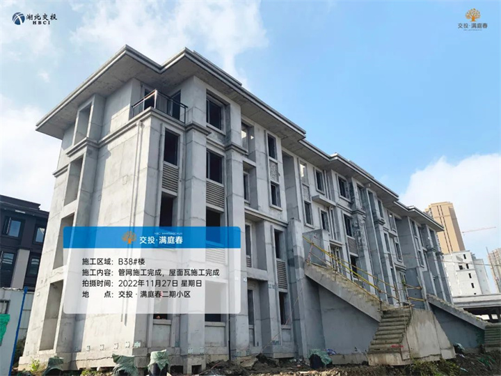 B38#、51#、53#楼,管网施工完成,石材龙骨施工,屋面瓦施工完成;