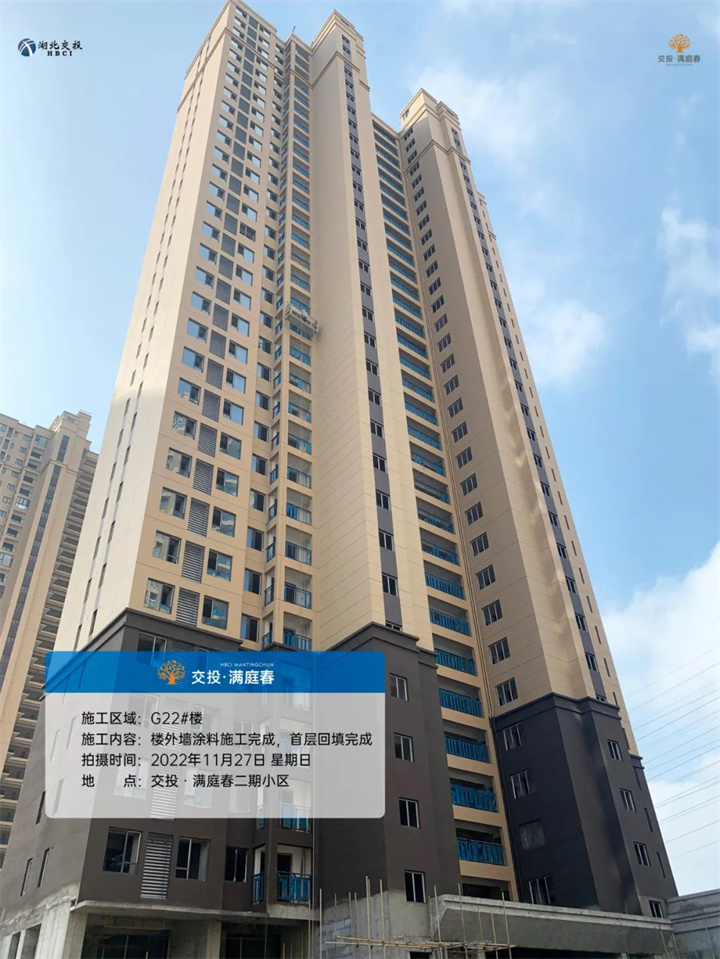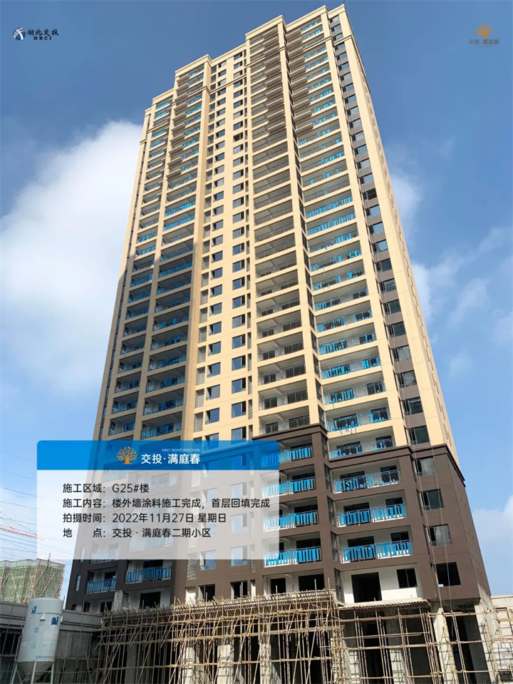 G22#楼、G23#楼、G25#楼,楼外墙涂料施工完成,首层回填完成: