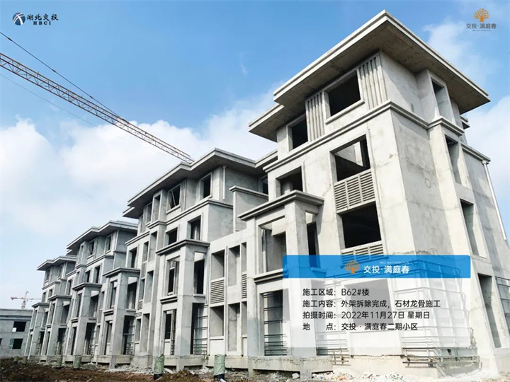 B62#楼内外抹灰施工完成,外架拆除完成,石材龙骨施工。