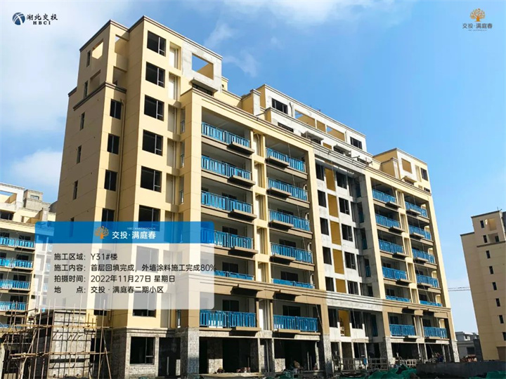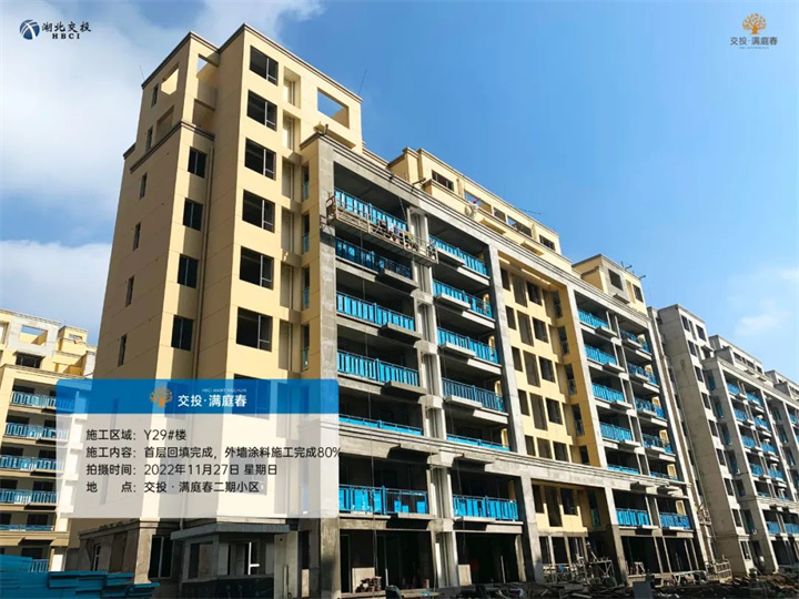Y29#、31#、33#楼首层回填完成,首层结构完成,公区铺贴施工完成,外墙涂料施工完成80%;