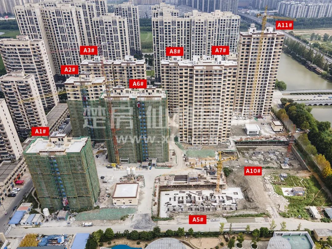A3#、A7#、A8#、A11#楼外立面已成型,内部隔断、电梯、消防管道等安装施工中