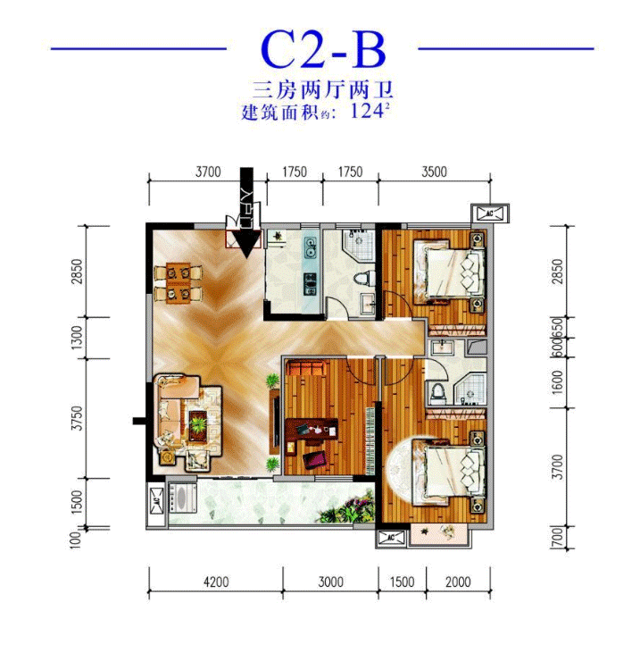 在建面约124㎡的户型做到了