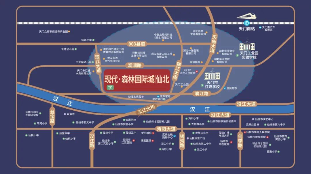 现代·森林国际城|天门作为在仙桃广受好评的现代城建集团又一力作,自然也是延续了之前项目的优秀品质,位于襄江路和锦江大道交汇处,坐落在仙北工业园区内,道路平整通畅,规划发展明朗,周边商超、农贸市场、教学等配套完善,地处天门、仙桃、汉川三市交界处,与仙桃主城区一江之隔,来往仙桃城区便利快捷。