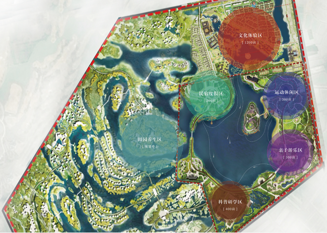 整片地块按照“一轴六区、一体两翼”的总体布局,以天鹅湖为中心,分期建设沔阳小镇的文化体验、运动休闲、亲子游乐、科普研学、民宿度假以及田园康养六大片区。