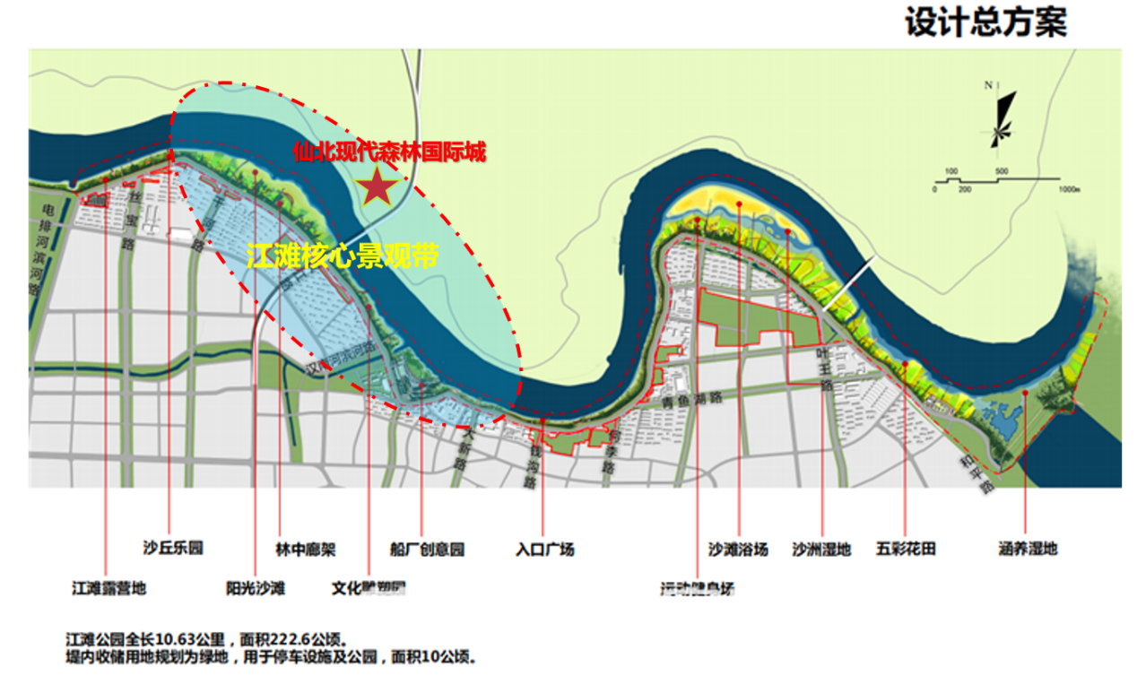 江滩公园全长10.63公里,共计222.6公顷,是仙桃斥数十亿资金打造备具沔阳文化的滨江公园。建设景观工程包括江滩露营地、沙丘公园、阳光沙滩、林中廊架、文化雕塑园、船厂创意园、城市看台、景观平台、运动健身园、沙滩浴场、沙洲湿地、五彩花田、湿地涵养等、建设道路包括堤顶公路、江滩防洪道及南北连接道路等。