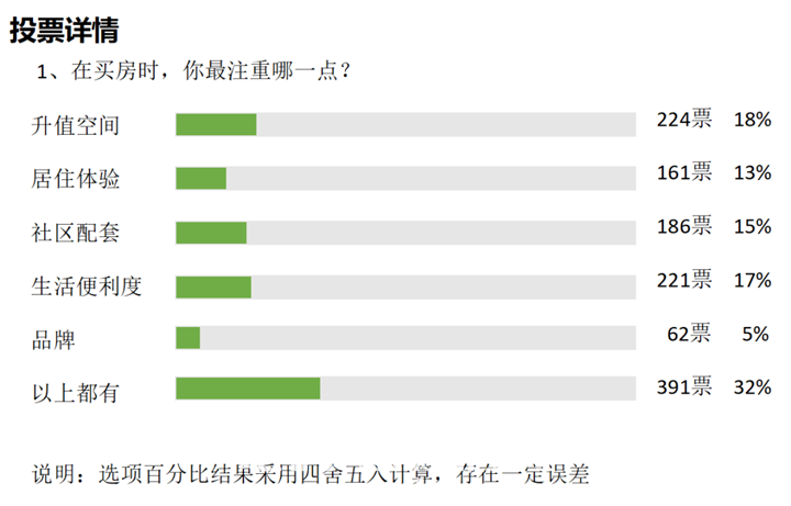 有13%的人选择了居住体验,18%的人选择了升值空间,15%的人选择了社区配套,5%选择了品牌,17%选择了生活便利度。还有32%的人,选择了“以上都有”。