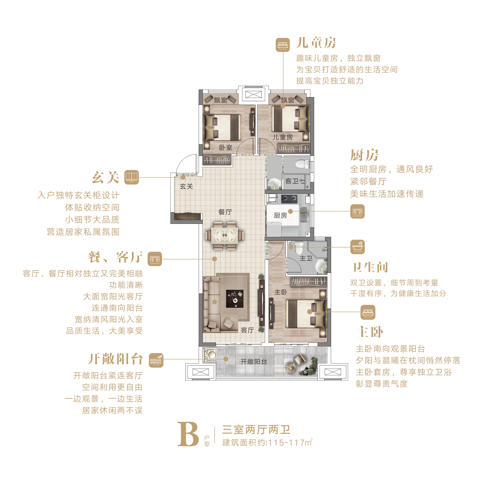 生活离不开温度,更需要舒心的尺度,金科·御府建筑面积约115—117㎡阳光三房,为远见者精筑的理想之境,赋予生活更多想象。