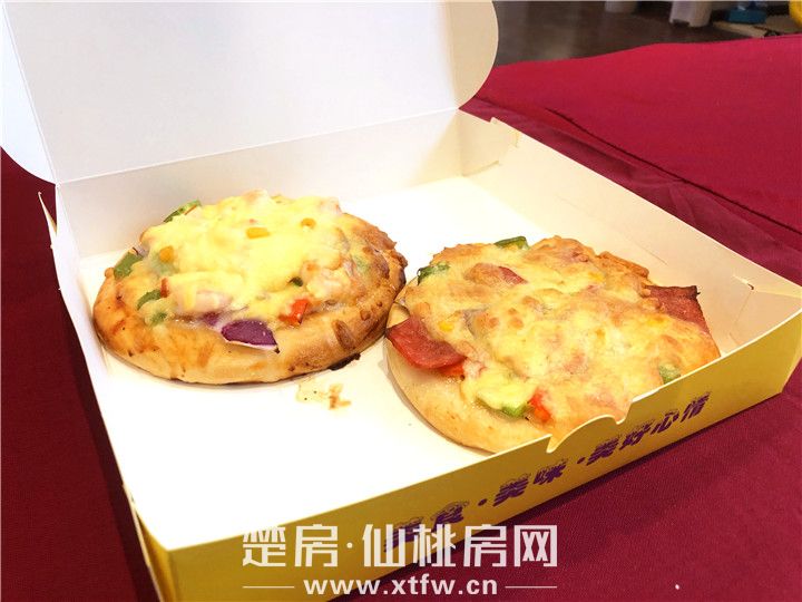 披萨制作完成后,香气弥漫这整个售楼部,工作人员切好摆盘,一块块披萨饼还可以拉丝,看的让人直流口水!